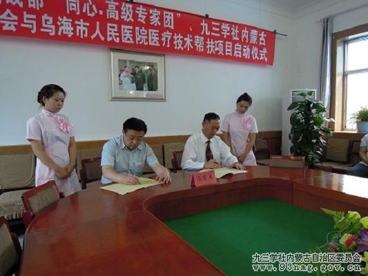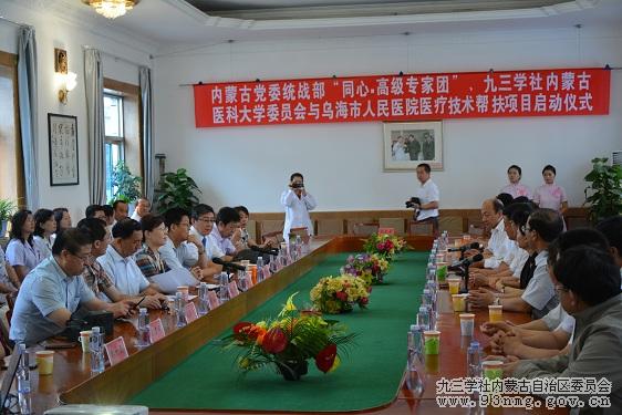 继2012年11月内蒙古自治区党委统战部和内蒙古医科大学扶助项目——与呼伦贝尔市人民医院的 “九地合作”医疗扶助项目圆满结束后。2013年6月21日上午由内蒙古自治区党委统战部和内蒙古医科大学党委主办,乌海市委统战部承办,九三学社内蒙古医科大学委员会和乌海市人民医院具体实施的对乌海市人民医院扶助项目启动仪式在乌海市人民医院隆重举行。