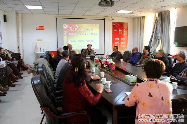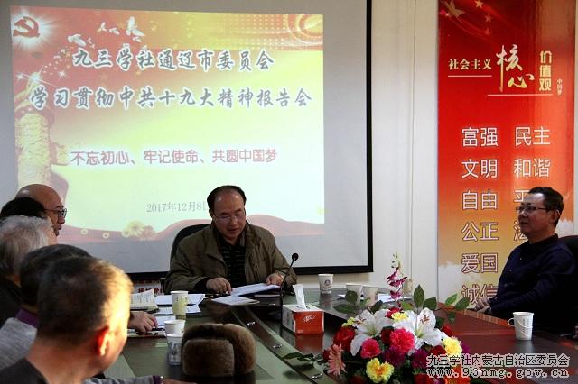 2017年12月8日下午,九三学社通辽市委员会组织召开了学习中共十九大精神报告会,会议由王湘涛主委主持,市委副主委李志刚、方俊平,基层组织班子成员以及广大骨干社员40余人参加了学习。84岁高龄的张宝华社员和74岁的乌力吉社员也兴致勃勃的参加了学习活动。